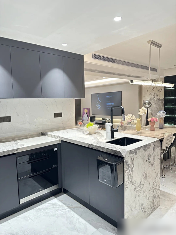沙发背景墙嵌展示柜放手办,既省空间又显个性;悬浮床头柜免了卫生死角;岛台高低差洗菜不弯腰。