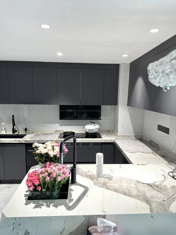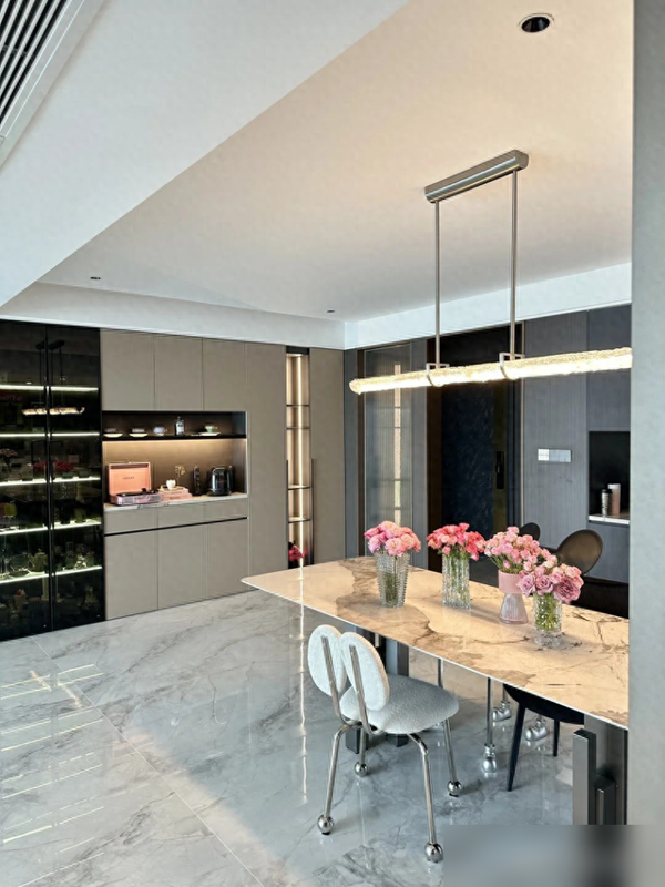 岩板餐桌配点粉调小摆件,冷峻里透出活气,比清一色大理石有人情味多了。